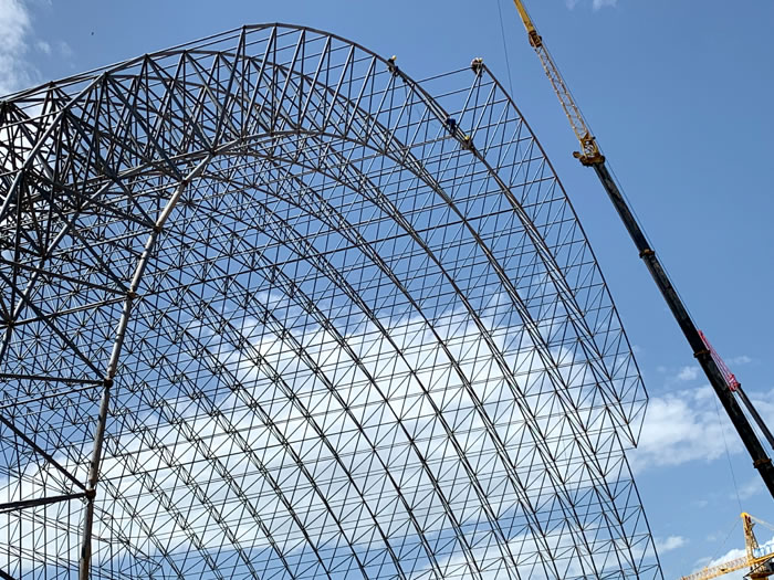 (2)网架加工前应对现场尺寸进行复测,确认无误后方可进行加工、安装;网架制作、运输、安装应遵守《空间网格结构技术规程》JGJ7-2010、《钢网架虎林螺栓球节点》JG/T 10-2009、《钢网架虎林螺栓球节点用高强度螺栓》 GB/T 16939-2016、《虎林钢结构虎林工程虎林施工规范》 GB50755-2012、《虎林钢结构虎林工程虎林施工质量验收标准》 GB50205-2020。